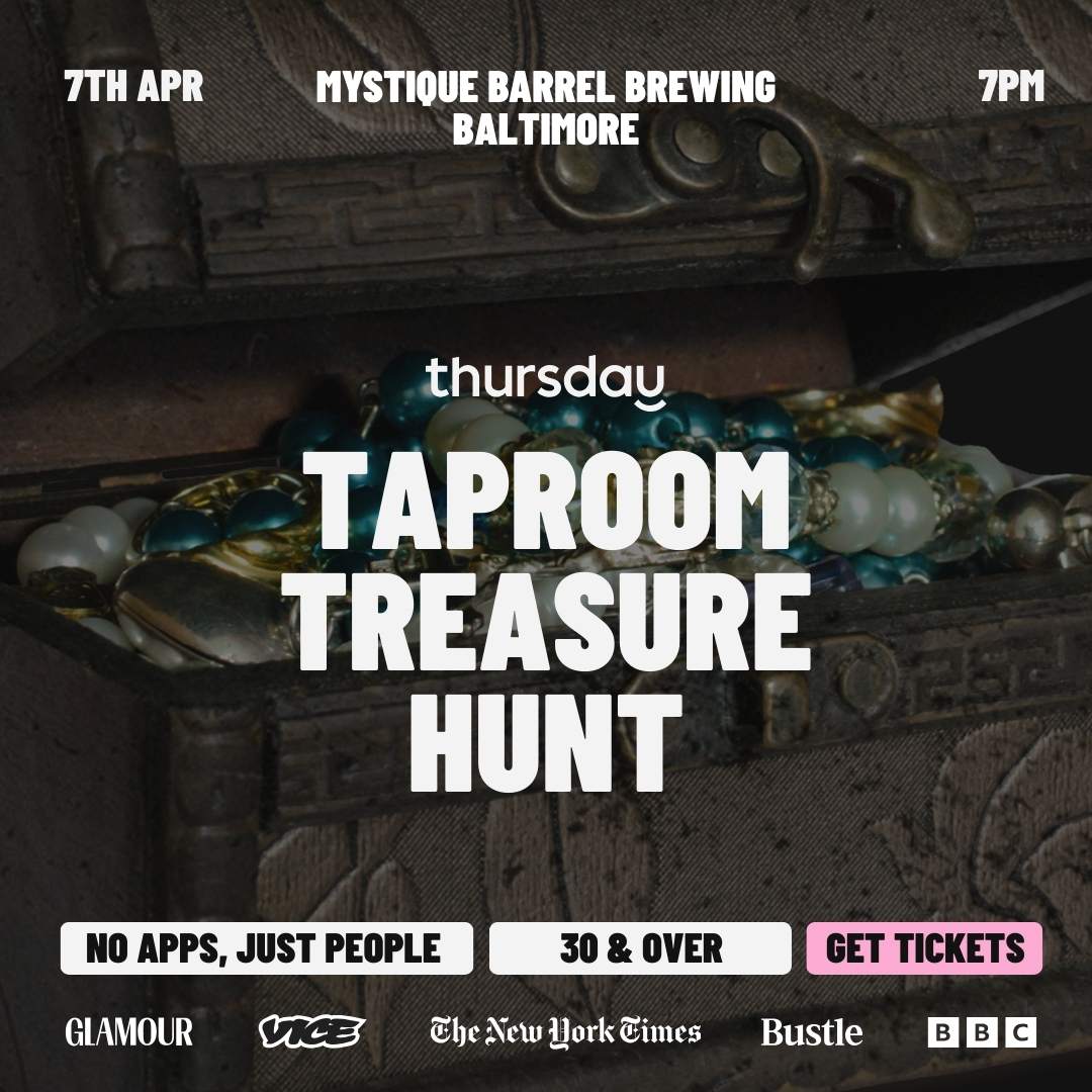 Tonight’s event is Taproom Treasure Hunt, a 30+ singles mixer where meeting someone new is part of the game. When you arrive, you’ll receive a challenge card with fun prompts like: