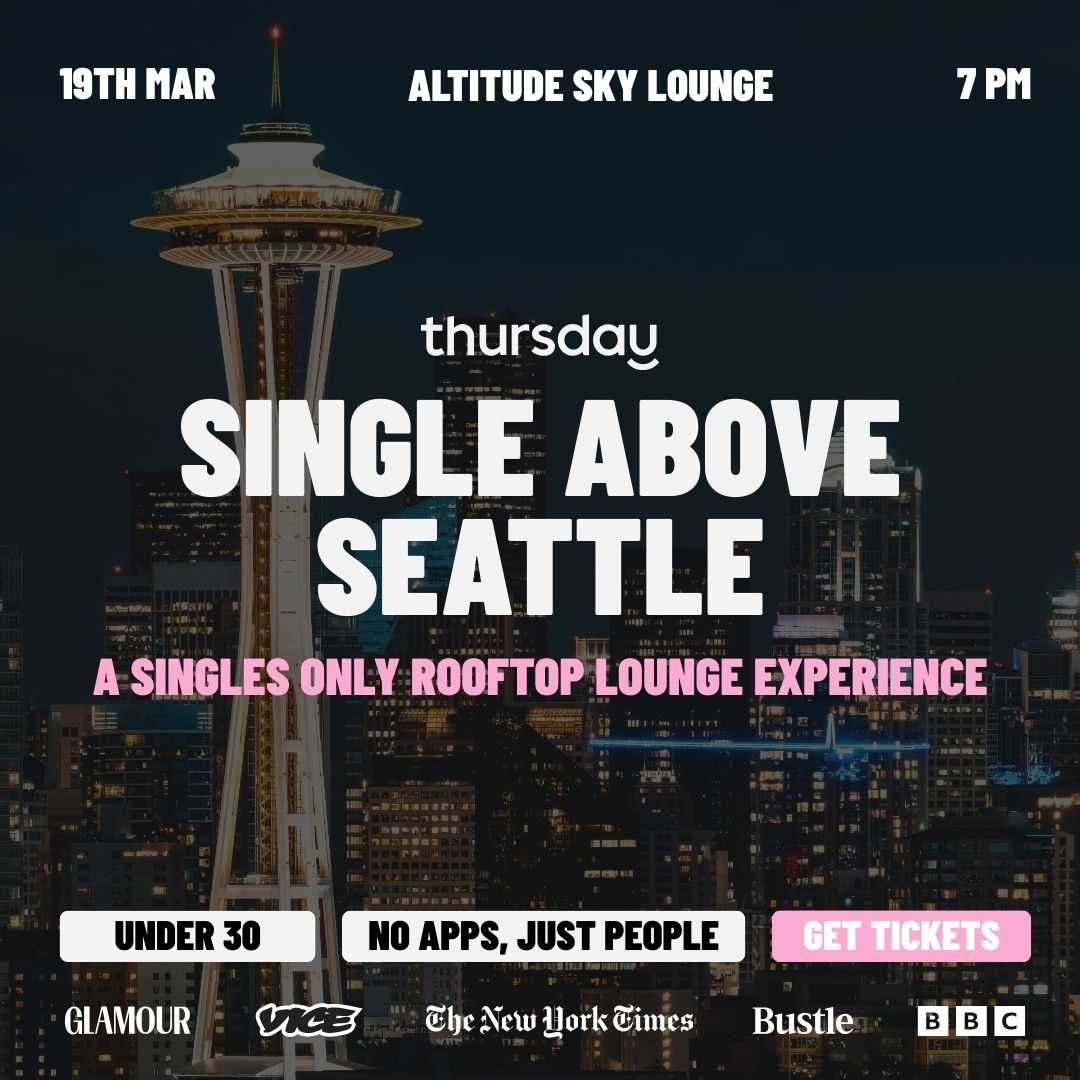 March 19, we’re taking over Altitude Sky Lounge for a singles-only rooftop party for people who are over the apps and ready for something way more fun. Space Needle views, cozy heaters, indoor-outdoor lounge space, drinks flowing, and a crowd of singles who came to actually talk to each other.